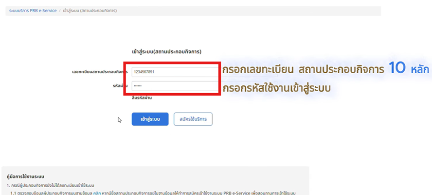 - กรอก เลขทะเบียนสถานประกอบกิจการ 10 หลัก และรหัสผ่าน