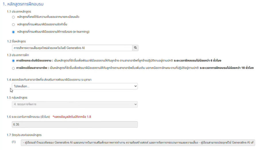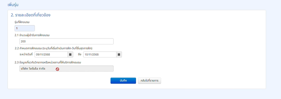 - 2.1 จำนวนผู้เข้าฝึก: ระบุจำนวนคน (e-Learning ไม่จำกัดจำนวน)