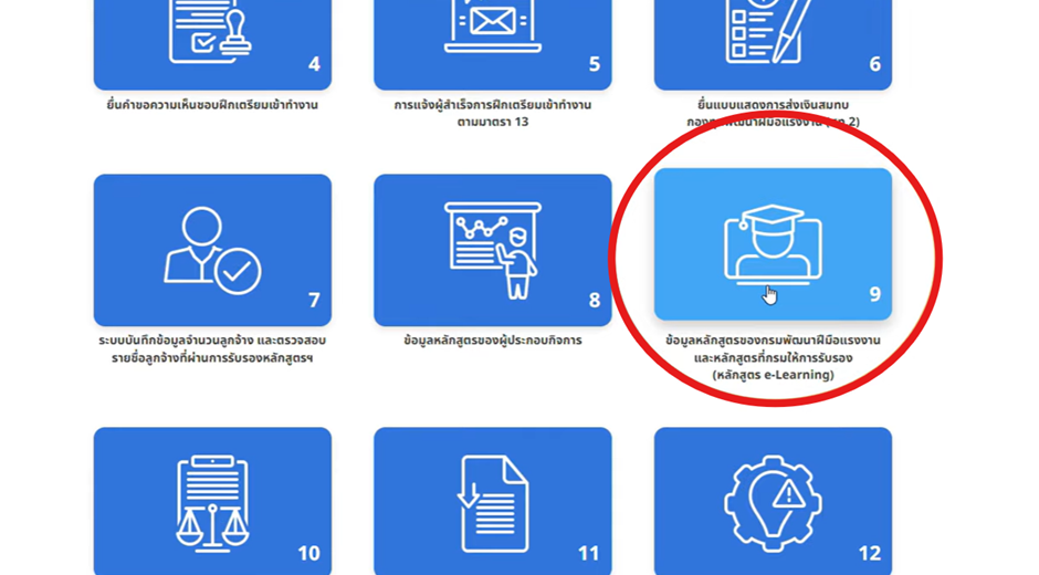 - เมื่อเข้ามาหน้าแรก ให้เลือกไอคอนหมายเลข 9 “ข้อมูลหลักสูตรของกรมฯ และหลักสูตรที่กรมรับรอง (e-Learning)”