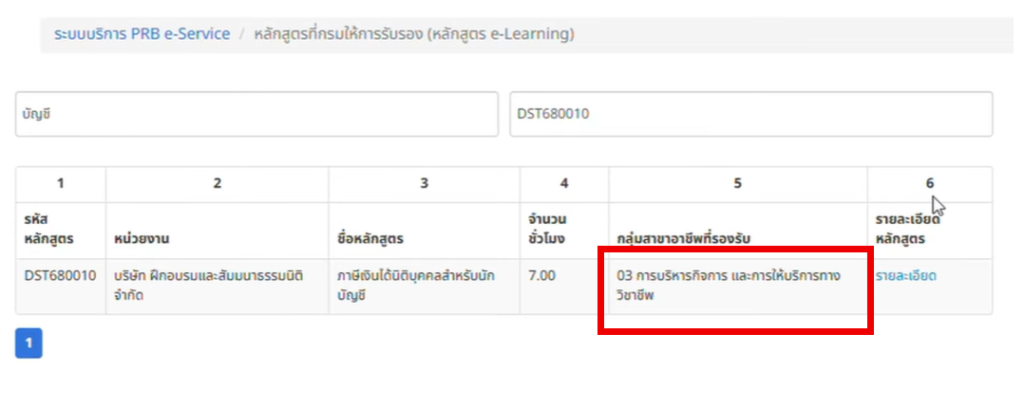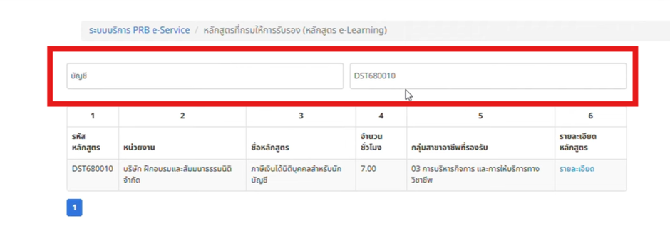 - ค้นหาด้วยชื่อ: พิมพ์คำค้น (Keyword) เช่น “บัญชี” ระบบจะแสดงทุกหลักสูตรที่มีคำว่าบัญชี