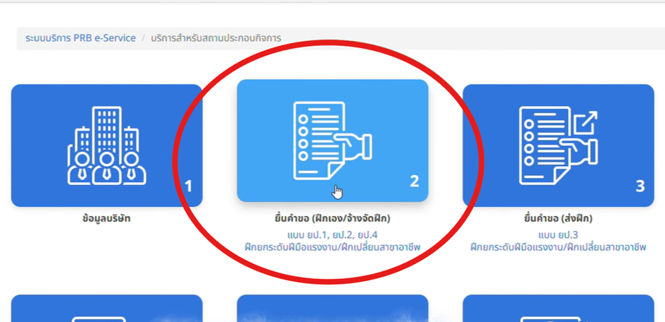 - กลับมาที่หน้าหลัก คลิกไอคอนที่ 2 “ยื่นคำขอฝึกเอง หรือจ้างจัดฝึก (ยป.1, ยป.2, ยป.4)”