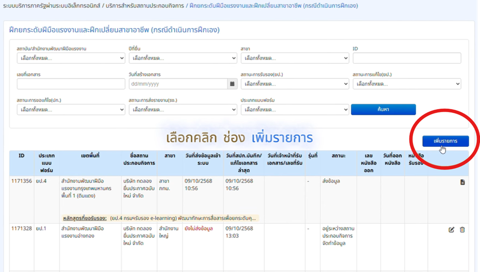 - กดปุ่ม “เพิ่มรายการ” (มุมขวาบนของตาราง)